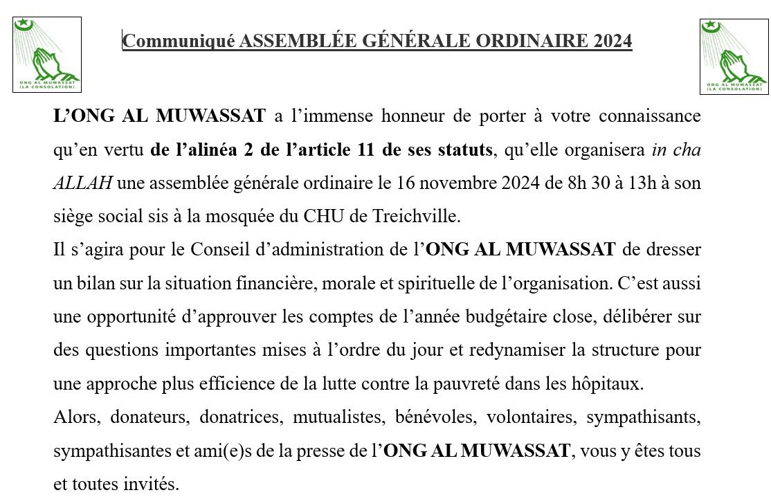 ALLAH une assemblée générale ordinaire le 16 novembre 2024 de 8h 30 à 13h à son